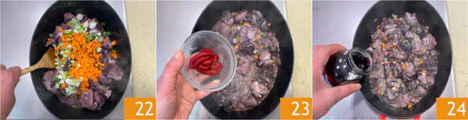 Sauté for a couple of minutes 22, then season with the tomato paste 23 and stir to combine. Deglaze with the red wine 34 and let the alcohol evaporate completely.