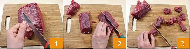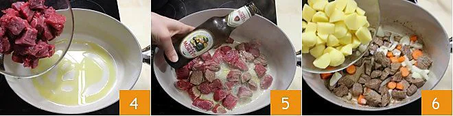 Brown the meat in a large pot with extra virgin olive oil 4 for a few minutes over high heat and deglaze with the beer 5. Cut the celery, carrot, and onion into coarse pieces and add them to the meat, stirring occasionally. Wash, peel, and cut the potatoes into pieces and add these to the meat as well 6.