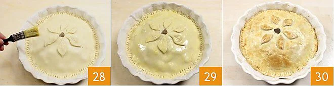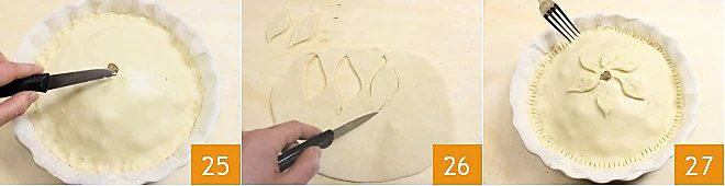 Make a hole in the center with the tip of a knife, which will serve to let the steam escape during cooking 25; with the pastry scraps, form small leaves or decorations of your choice to embellish the pastry 26. Slightly score the edge of the shortcrust pastry with the tines of a fork to obtain a decorative effect and to seal the edges well 27.