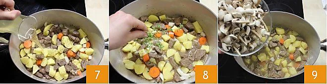 Cover the ingredients with hot broth 7, add salt and pepper, and add the thyme sprigs 8; stir and finally add the cleaned and sliced champignon mushrooms 9. Cover the pot with a lid and let the stew simmer for about an hour over low heat, adding broth from time to time if necessary.