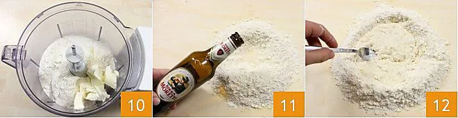While the meat is cooking, prepare the beer-based shortcrust pastry: blend the flour with the cold diced butter in a mixer 10 to obtain a sandy mixture. Transfer the mixture onto a work surface and form a well in the center where you will add the cold beer 11. Gather the ingredients by first whisking with a fork in the center 12;