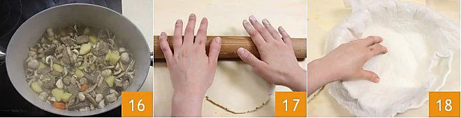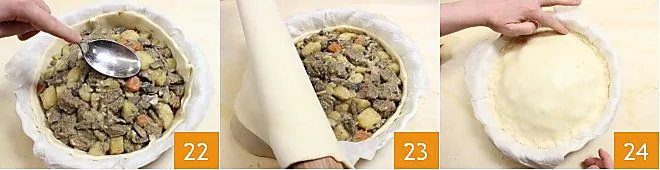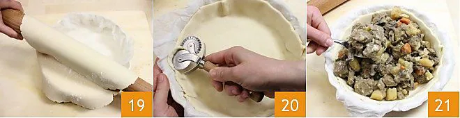 cover the baking tin with the first sheet of shortcrust pastry 19, cutting off the excess pastry with a pasta cutter to obtain an edge about 1/2 inch high 20. Fill the crust with the cold stew 21 and