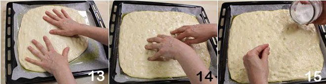 then take the dough and roll it out with your hands 13. Use your fingertips to make indentations in the flatbread 14, then sprinkle with coarse salt (not excessively) and rosemary needles on the surface 15 and let it rise for 30-40 minutes in the oven turned off with the light on. Bake the flatbread in a preheated oven at 390°F for about 30 minutes, until it is golden brown. Remove the flatbread from the oven and place it on a rack to prevent the sweating from making it lose its crunchiness. As soon as it is warm, cut the Romagna flatbread and serve it with cold cuts and cheeses.