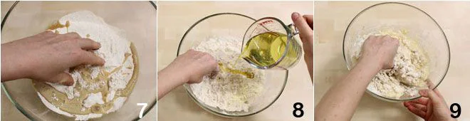 and mix with your fingertips to incorporate it 7, then also add the water, salt, and oil mixture 8, kneading everything carefully 9. Once the ingredients are well combined, continue to work the dough on a work surface for at least 10 minutes until you obtain a smooth and homogeneous mixture.