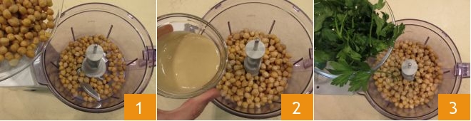 To make the wrap with spicy hummus and vegetables, start with preparing the hummus: pour the pre-cooked chickpeas 1, tahini 2, and parsley 3 into a blender,