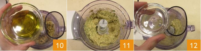 Turn on the blender and, while it's running, pour olive oil in through the designated opening 10 to obtain a smooth mixture 11. At this point, add water 12 based on the preferred consistency, for a less dense hummus, add more water.