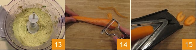 Store the ready hummus in the refrigerator 13 and move on to the vegetables: wash, trim, and peel the carrots 14, then thinly slice them using a mandoline 15