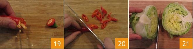 Trim the fresh chili, remove the seeds 19, and slice it into rounds 20. Divide the iceberg lettuce in half 21,