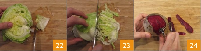 remove the core 22, and slice it to get strips 23, then wash and dry them with paper towels. Finally, peel the beetroot 34,