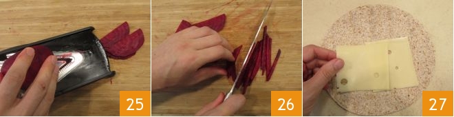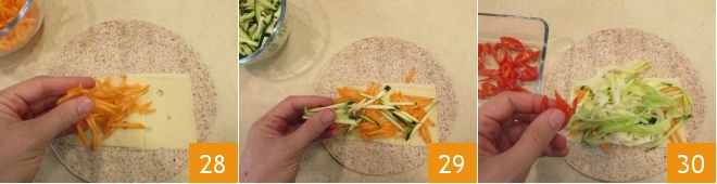 cut it in half, then slice each half with the mandoline 25 and cut sticks from the slices as done earlier 26. Everything is ready to assemble the wrap: fill a whole wheat tortilla with two slices of Emmentaler cheese 27