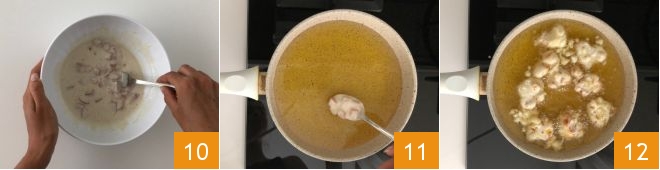 and mix 10 to distribute them evenly. In a pan, heat the seed oil; for optimal frying, we recommend heating the oil to about 340°F. Once the oil is hot, take a teaspoon of batter and drop it into the oil 11. Cook the fritters for one minute 12