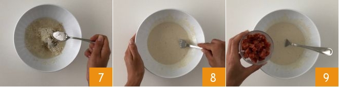 Finally, add the instant yeast 7, mix to combine the ingredients well, and you should have a smooth and slightly runny batter 8. At this point, add the salami cubes 9