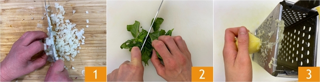 To prepare the spinach burgers, first peel and finely chop the onion 1. Then wash the spinach, drain it, and chop it coarsely 2. Peel the potatoes and grate them raw 3.