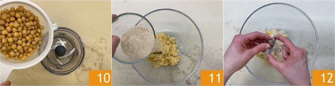 Meanwhile, blend the cooked chickpeas 10 until you get a coarse cream. Transfer the chickpea puree to a large bowl and add breadcrumbs 11 and nutmeg 12.