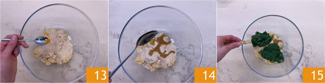 Add the turmeric 13 and 2 tablespoons of oil 14. Then add the spinach and potato mixture 15.