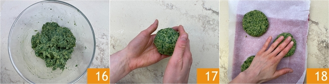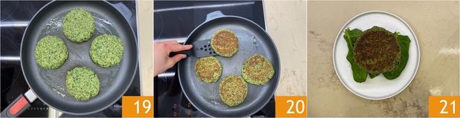 Cook the burgers in a lightly greased non-stick pan 19 for 10 minutes, flipping them halfway through cooking 20 so they are well browned on both sides. Serve your spinach burgers immediately 21.
