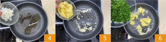In a pan, pour two tablespoons of oil, add the chopped onion 4, and let it soften over low heat for about 5 minutes. Then add the potatoes 5 and spinach 6.