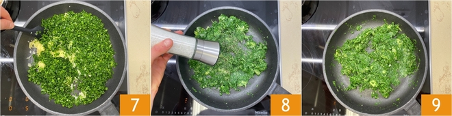 Cook for about 5-6 minutes over medium heat, stirring occasionally 7 and adjusting with salt and pepper 8. When the mixture is soft and dry, turn off the heat 9 and let it cool slightly.