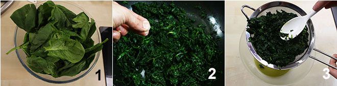 To prepare the spinach flans, wash the spinach 1 and let them wilt in a pan over low heat with a drizzle of extra virgin olive oil for about 10 minutes; then lightly salt them 2. Squeeze the spinach well 3 and