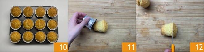 After this time, check the baking with a skewer and remove the muffins from the oven 10, then let them cool. Remove the muffins from the molds 11 and cut off the top using a serrated knife 12.