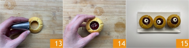 Create a hole in the center of the top with a 1-inch cutter; alternatively, you can use the nozzle of a piping bag 13. Spread the jam over the muffin base and put the cut top back on 14. Place a sugar eye in the center of the hole, where the jam now is 15. Your spooky bull's eye muffins are ready to be served!