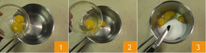 To prepare the sporcamuss, start by making the custard: pour the egg yolks 1, the whole egg 2, sugar, and vanilla seeds 3 into a saucepan (keep the pod aside).