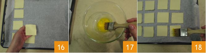 Transfer them gradually onto a baking sheet lined with parchment paper 16, spacing them apart. Beat an egg yolk in a bowl 17 and use it to brush the surface of the squares 18.