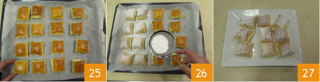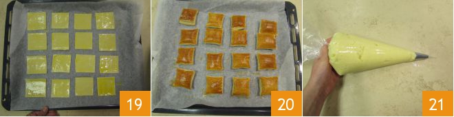 Cut the first puff pastry square, dividing it in half like a sandwich 22. Fill the base with custard 23, close it with the top part 34