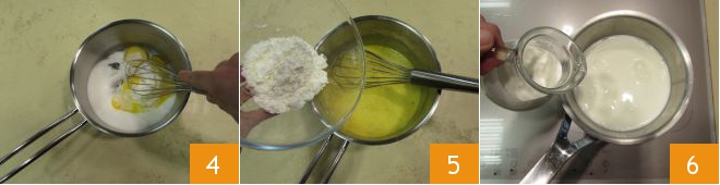 Work with a whisk 4 until you get a homogeneous mixture, then add the starch 5 and whisk again. At this point, pour milk and cream into a saucepan 6,