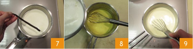 add the previously emptied vanilla pod 7 and bring to a simmer. As soon as it starts to boil, transfer the milk and cream into the saucepan with the egg and sugar mixture, stirring constantly with a whisk 8. Place the saucepan on the stove 9