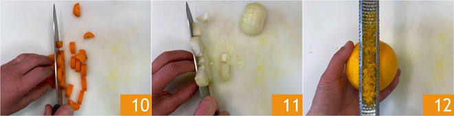 Meanwhile, finely chop the carrot 10, onion 11, and celery. Grate the orange zest 12.