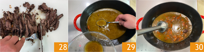 Once cooked, cut the ribs into pieces 0.8 inches thick and 3.9 inches long 28. Remove excess fat from the cooking base 29, then blend briefly 30.