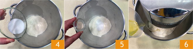 In the bowl of a stand mixer, place the flour, add the sugar 4, and the yeast 5. Start the machine and slowly pour in the water and oil mixture 6. Knead until the dough is elastic.