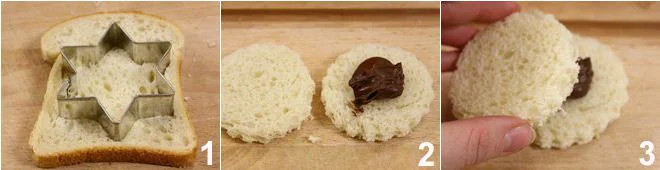 To prepare Nutella stars, start by cutting the sandwich bread with a star-shaped cookie cutter 1; you can naturally use the shape you prefer (heart, flower, circle). Take the Nutella, which you have put in the refrigerator for half an hour to firm up a bit (alternatively, put it in the freezer for 10-15 minutes), and place a teaspoon on the sandwich bread shape 2, then cover with another shape 3 by pressing lightly on the edges. Continue like this for all the others.