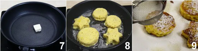 Melt the butter in a non-stick pan 7, place the shapes in it 8, and cook them on both sides until they are nicely golden. Then place them on a sheet covered with absorbent paper, dust them with powdered sugar, and cover with some colorful sprinkles... serve them hot!