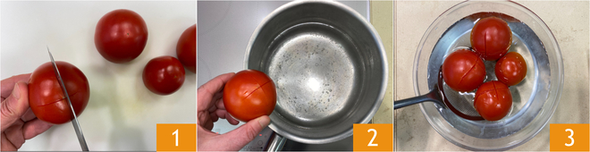 To prepare the stockfish and potatoes stew, first bring some water to a boil. Make a cross cut on the bottom of the tomatoes 1 and immerse them in the boiling water 2 for 1-2 minutes. Drain them and cool them in cold water 3.