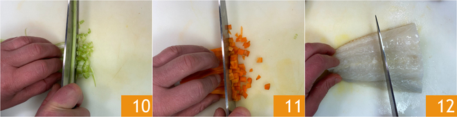 Do the same for celery 10 and carrots 11. Cut the stockfish into 2-inch pieces 12.