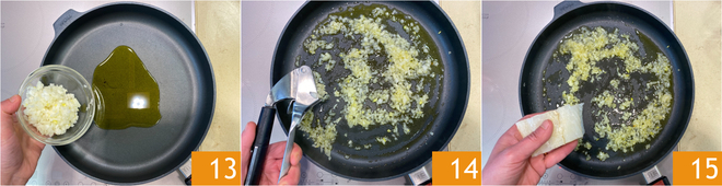 In a pan, pour the oil, add the onion 13 and minced garlic 14. Pour in some water, taken from the total, and stew for 5-6 minutes over medium heat. Place the stockfish in the pan, skin side down 15.