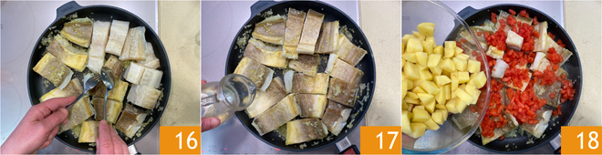 Sauté for 2-3 minutes. Flip the fish over 16 and sauté for another 2-3 minutes. Deglaze with white wine 17 and let all the alcohol evaporate. Add the tomatoes and potatoes 18.