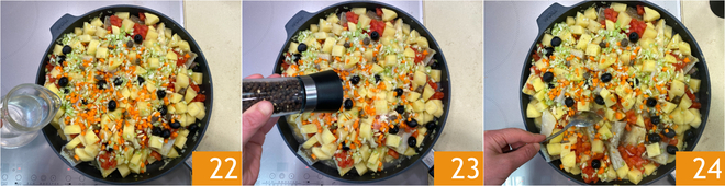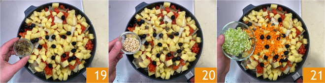 Continue with the olives, previously desalted capers 19, pine nuts 20, carrots, and celery 21.