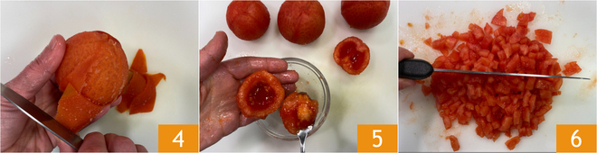 Peel the tomatoes 4, cut them in half, remove the seeds 5 then finely chop them with a knife 6 and set aside.