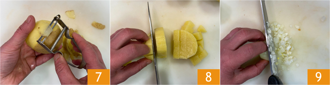 Peel the potatoes 7 and cut them into 1-inch cubes 8. Finely chop the onion 9.