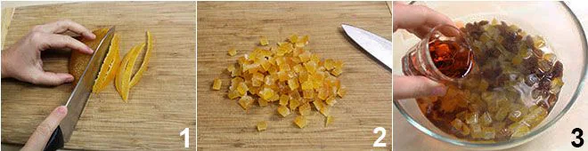To prepare the stollen, start by cutting the candied orange into slices and then into cubes (1-2). Soak it together with the raisins in a bowl with warm water, so that everything is covered to the brim, and 50 ml of rum taken from the total amount 3.