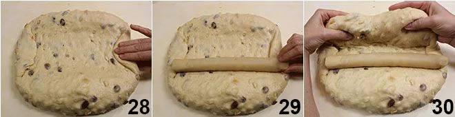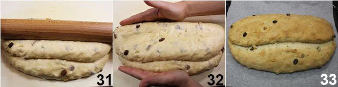 press with the rolling pin in the center to seal well and give the stollen its classic shape 31. Shape it a little with your hands to give the stollen a regular form 32 and place it on a baking sheet lined with parchment paper. Bake in a static oven preheated to 356°F for about 60-70 minutes, until the stollen is amber 33.