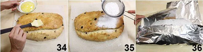 Once out of the oven, immediately brush with melted butter 34 and sprinkle with plenty of sifted powdered sugar 35, then let it cool on a rack. Wrap it in aluminum foil and let the stollen rest in a cool place (but not in the refrigerator) for a couple of days before consuming it, so it absorbs moisture and reaches its classic consistency. Good Stollen and Merry Christmas to all!!