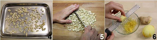 In the meantime, place the blanched almonds on a baking sheet and toast them in the oven until they are crunchy but not too colored 4. If you have almonds with the skin, scald them for 5 minutes in boiling water and then remove the skin, which will come off easily this way. When the almonds are cool, chop them coarsely 5 and set them aside. Grate the lemon zest and ginger into a bowl and set aside 6.