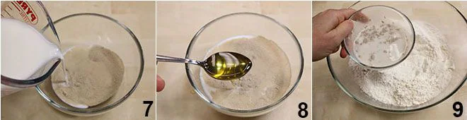 Dissolve the yeast (you can also use a crumbled cube of fresh brewer's yeast) in a little warm milk (taken from the total amount in the recipe) and add a teaspoon of honey (7-8). Place the flour in a bowl and make a well in the center, where you will pour the yeast 9.