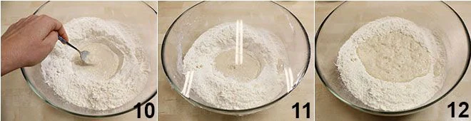 Mix with a teaspoon, incorporating a little flour into the yeast until you get a batter-like mixture, which you will leave in the center without kneading 10. Cover everything with plastic wrap 11 and let it rise for at least half an hour in a warm place until the mixture doubles in volume 12.