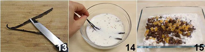 While the batter is rising, cut a vanilla bean in half and scrape out its seeds with the blade of a small knife 13. Place the opened bean and seeds in a bowl containing the remaining milk, which you have warmed 14. Then melt the butter and let it cool; finally, drain the raisins and candied orange, pat them with paper towels to dry them, pass them through the flour 15, and then through a sieve to remove the excess.