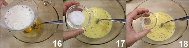 At this point, in a bowl, beat the two eggs and add the milk in which you had infused the vanilla (removing the bean beforehand) 16. Add the salt and cardamom 18 and finally